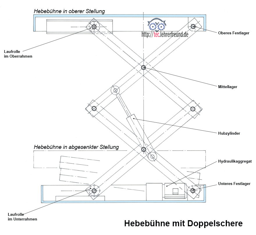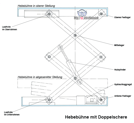 Die Hubbühne wird von einem E-Motor mit angeflanschtem Hydraulikaggregat angetrieben. Ihr Zweck liegt darin, Lasten nach oben oder unten zu bewegen, oder Niveauunterschiede auszugleichen. Seitliche Bewegungen sind nicht möglich. Die Hebebühne wird über Scherenhebel-Elemente bewegt. Ein Scherenhebel oder Scherenhebel-Element besteht aus zwei über Kreuz gelegte Stäben, die in der Mitte gelenkig verbunden sind. Diese Verbindung erlaubt das Aufklappen und Zuklappen der “Schere” – genau wie bei einer Papierschere.