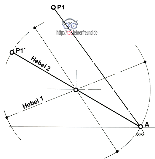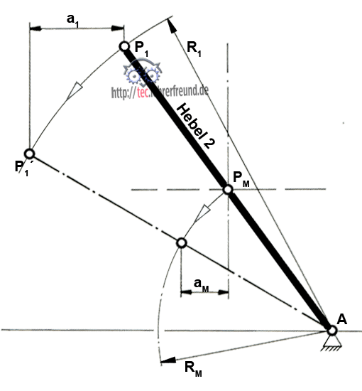 Bild 1 unten: Hebel 2 dreht sich um A. Dabei beschreibt P1 einen Bogen mit R1 und wandert dabei nach P1´. Die Hebelmitte PM bewegt sich auf dem Radius RM. PM macht dabei die seitliche Bewegung aM.