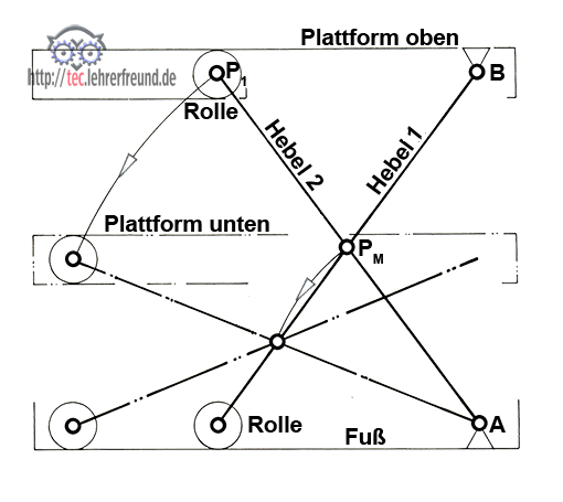 Weil P1 beim Einklappen nach links wandert, muss P1 eine Gleitmöglichkeit besitzen. Sie ist hier als Rolle ausgeführt, die die horizontale Bewegung ermöglicht. Die Scherengeometrie nimmt auch die untere Rolle nach links mit. Dabei ergibt sich aus Symmetriegründen sowohl zwischen den Punkten A und B sowie zwischen den beiden Rollen oben und unten derselbe senkrechte Abstand.