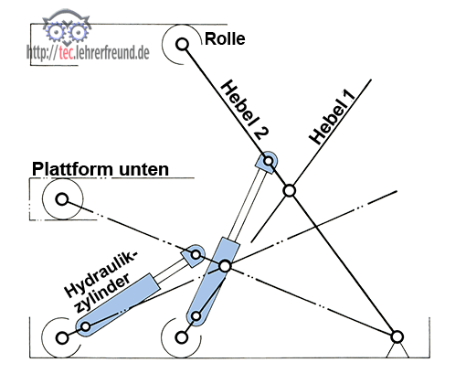 Ähnlich wird auch die vorliegende Hebebühne entstanden sein. Der Konstrukteur weiß, wo Schwachpunkte in der Festigkeit sein könnten und wird auf diese Stellen beim Konstruieren sein Augenmerk richten. Im Fall der Hebebühne sind es die Gelenke, aber auch die Rollen, die hohen Flächenpressungen ausgesetzt sind. Hier hilft ihm oft genug eine Überschlagsrechnung weiter, um zu sehen, wie weit entfernt er von gefährlichen Zuständen ist. Auch erkennt er sofort, dass in heruntergefahrener Position der Hydraulikzylinder ziemlich würgen muss, um den flachen Hebel wieder aufzurichten. Dies ist mit besonderen Schmerzen für den Gelenkbolzen und den Hebelquerschnitt verbunden. Um diese Kraft genau zu ermitteln, müssten wir wissen, was sich an Hebel 2 insgesamt kräftemäßig abspielt.