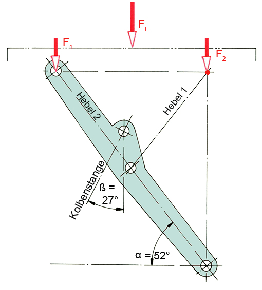 Wir berechnen den Hebel 2 (Bild ganz oben). Auf der Plattform steht mittig eine Last FL. Sie verteilt sich bei vier Hebeln auf vier Auflagerpunkte. Hebel 2 wird also mit F1 = F2 = FL / 4 belastet.