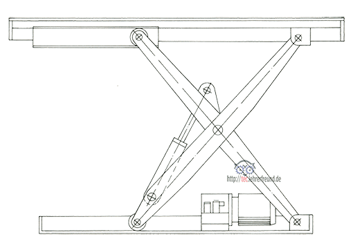 Ausgangspunkt ist eine Einfachscheren-Hebebühne wie im Bild unten. Es zeigt den Aufbau und benennt die Bauteile der Scherenbühne. Mit ihren Abmessungen ist sie einer auf dem Markt befindlichen Hebebühne nachempfunden.
