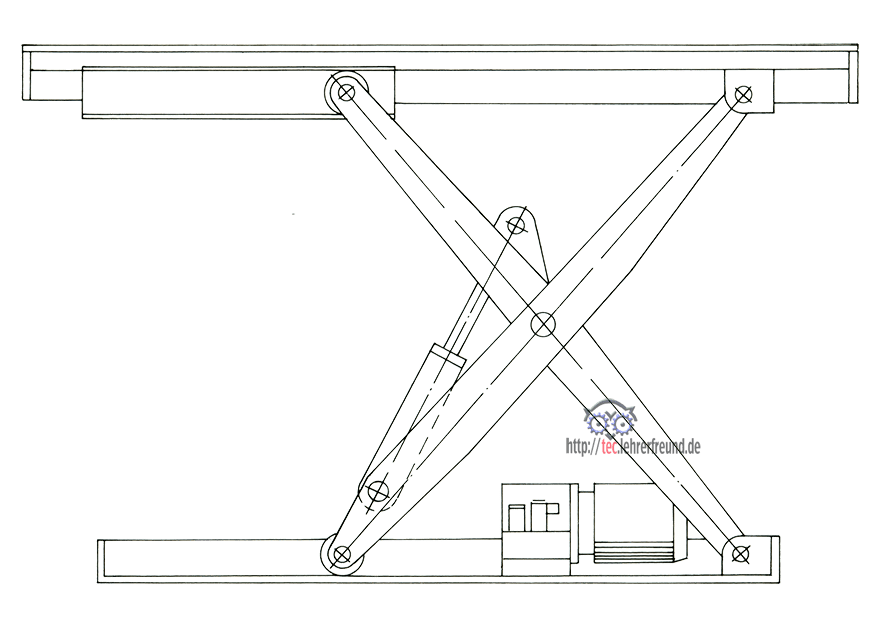 Wir stellen eine Einfachscheren-Hebebühne vor. Doch – so einfach die Konstruktion aussieht, so aufwendig wird es, wenn man versucht, die am Scherenhebel wirkenden Kräfte zu ermitteln.