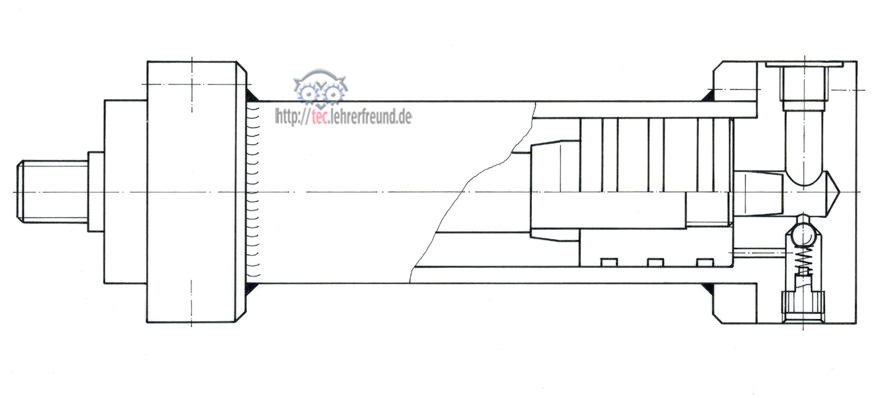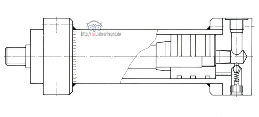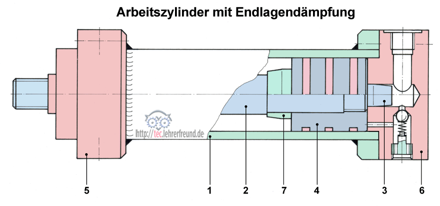Bei Zylindern ohne Endlagendämpfung besteht die Gefahr, dass der Kolben in den Endlagen hart gegen den Zylinderkopf bzw. gegen den Zylinderboden fährt. Eine spezielle Endlagendämpfung verhindert dies. Beschreibung der Endlagendämpfung und Zeichnungsaufgaben dazu.