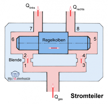 Stromteilventile teilen einen Eingangsförderstrom in zwei Teilströme auf. Dabei bleibt das aus beiden Teilförderströmen gebildete Verhältnis Qlinks / Qrechts konstant. Die vereinfachte Darstellung zeigt, wie ein Stromteiler funktioniert. Wesentlich für ihn sind die beiden unterschiedlich großen Blendenquerschnitte zwischen 1 und 2 sowie 3 und 4, die die Teilströme bestimmen.