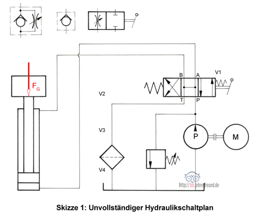 Skizze 1 zeigt einen unvollständigen Schaltplan. Der Kolben soll nach Bedarf die Last FG soll anheben und absenken. Zwischen P und dem Zylinder werden die beiden Rückschlagventile V3 und V4 aufgedrückt.