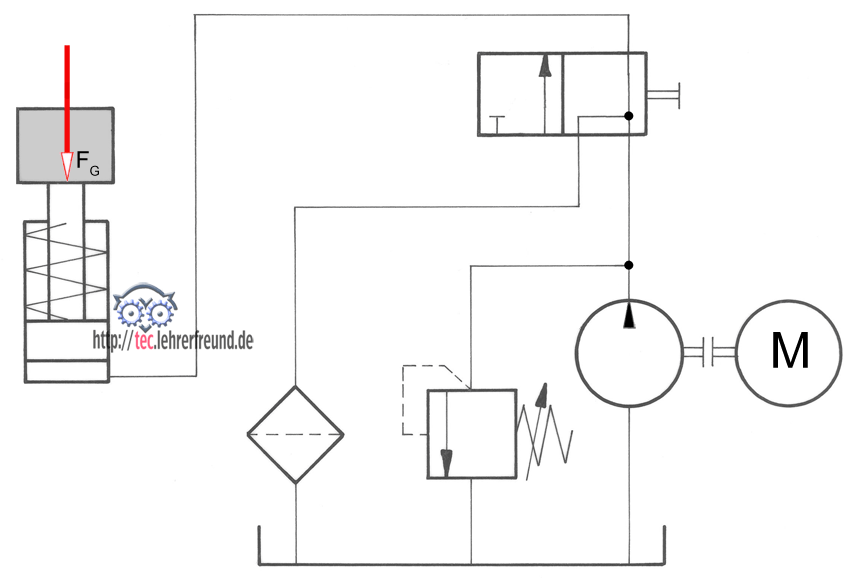 Das Gewicht FG soll angehoben und abgesenkt werden. In der gezeichneten Schaltstellung fördert die Pumpe das Öl über die Umlaufstellung im 3/3-Wegeventil zum Tank zurück.