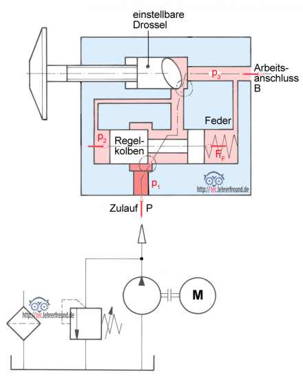 Bei gleich bleibendem Druck p1 würde mehr Öl durch das Ventil fließen. Der kleinere Druck p3 lässt auch p2 sinken: Die auf die linke Seite des Regelkolbens wirkende Kraft wird kleiner. Der Regelkolben bewegt sich nach links. Der Drosselspalt am Regelkolben wird größer; p2 sinkt, bis an der oberen Drossel wieder die gleiche Druckdifferenz p3 - p2 von zuvor herrscht. Auf diese Weise wirkt der Regelkolben als »Druckwaage«. Die Größe des Volumenstroms wird durch Verändern des Drosselquerschnitts oben festgelegt.