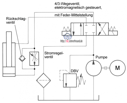 Das Stromregelventil ist in den Zulauf zum Hydrozylinders geschaltet. Es arbeitet mit dem Druckbegrenzungsventil zusammen: Von dem von der Pumpe geförderten Öl Förderstrom fließt ein Teil über das Druckbegrenzungsventil in den Tank ab. Der restliche Förderstrom fließt über das in der Schaltstellung »links« stehende 4/3-Wegeventil durch das Stromregelventil zum kolbenseitigen Raum des Arbeitszylinders.