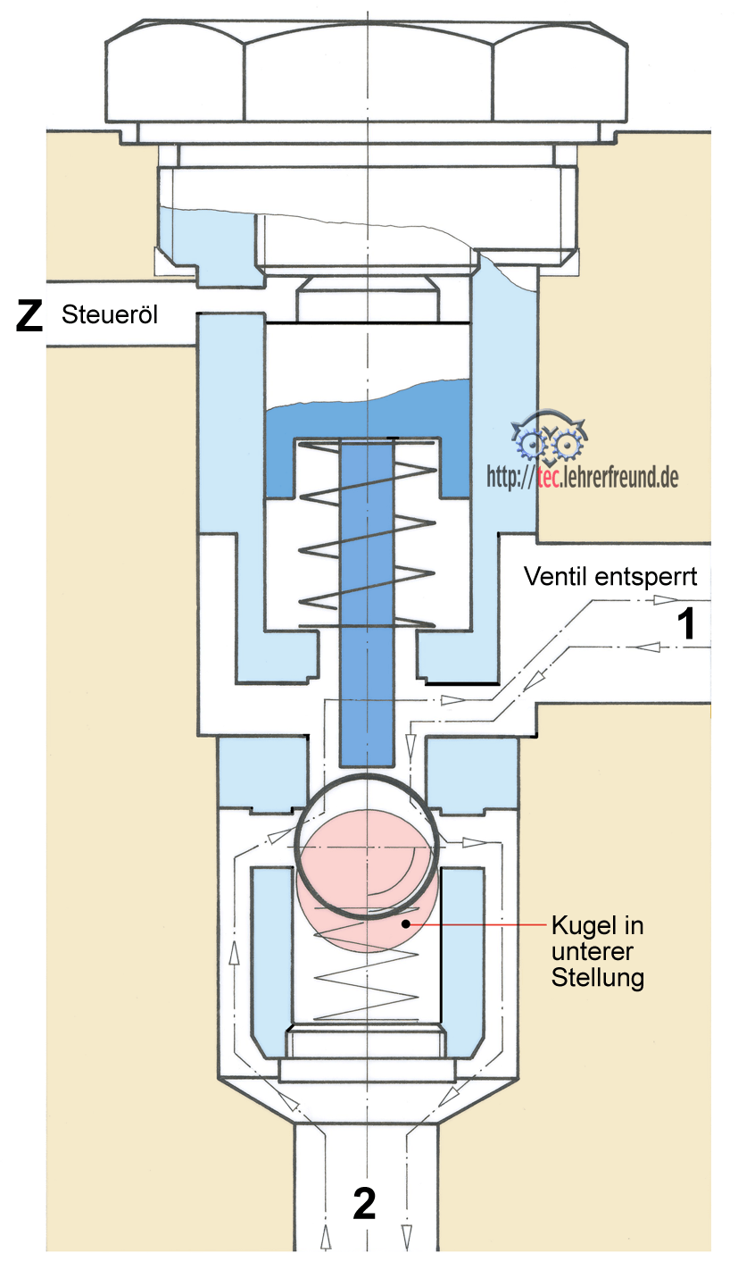 Entsperrvorgang: Bei einem genügend hohen Druck am Anschluss Z bewegt sich der obere Kolben nach unten. Der mit dem Kolben verbundene Stift drückt die Kugel vom Ventilsitz weg; Öl kann von 2 nach 1 strömen.