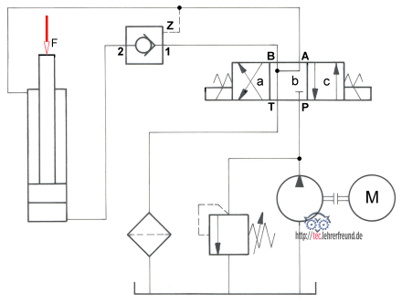 Wegeventilstellung c: Die Pumpe fördert von P über A Öl in den Kolbenstangenraum, aber: Das Öl auf der Kolbenseite kann wegen der Sperrposition des Rückschlagventils nicht entweichen. Auf der Kolbenstangenseite steigt der Druck so lange an, bis die Kugel über die Steuerleitung Z aufgedrückt wird; das Ventil ist entsperrt. Jetzt kann das Öl von der Kolbenseite über B und T in den Tank strömen.