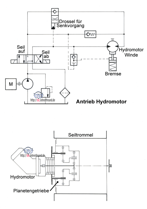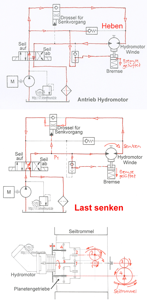 Die Pumpe fördert das Öl zu einem elektromagnetisch betätigten Wegeventil mit drei Schaltstellungen, zwei davon für das Heben und Senken der Last. Die Seiltrommel selbst wird von einem mechanisch abbremsbaren Hydromotor angetrieben. Das Heben geschieht mit vollem Förderstrom, das Senken mit gedrosseltem Förderstrom. Dafür ist zwischen Hydromotor und Wegeventil ein zweites, hydraulisch betätigtes Wegeventil geschaltet, das ein Rückschlagventil und ein Drosselventil besitzt.