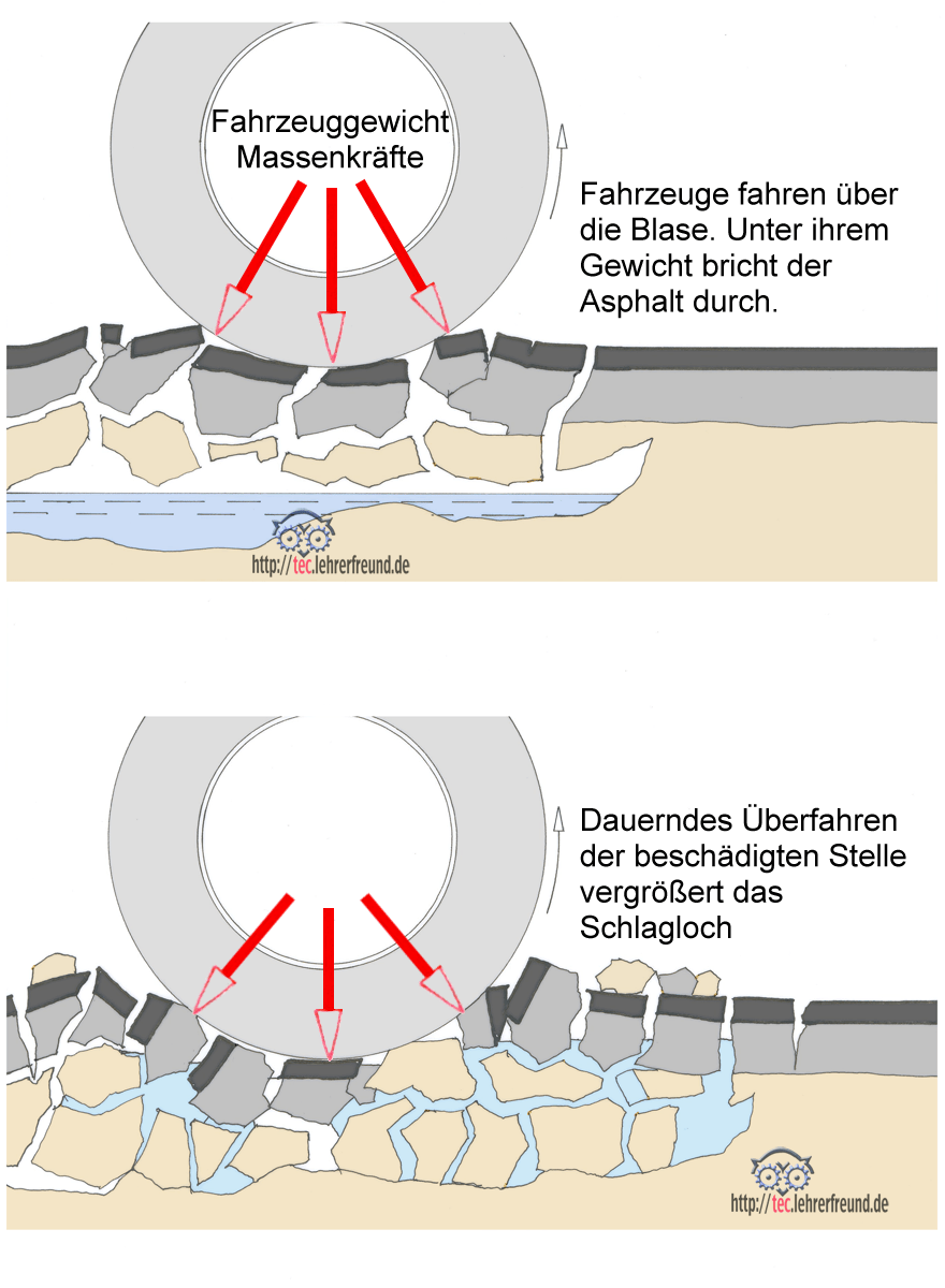 Auf vielen deutschen Straßen sind nach einem langen Frostwinter Baukolonnen unterwegs, um die schlimmsten Straßenschäden zu flicken. Vier Wochen Eis und Schnee haben die Straßen schwer ramponiert. Wie im Winter ein Schlagloch entsteht.