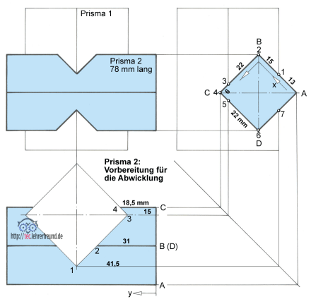 Wenn sich Prismen durchstoßen, entstehen geradlinige Durchdringungs- und Abwicklungslinien. Eine Anleitung zum Konstruieren dieser Linien.