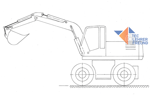Statikaufgabe. An einem Mobilbagger sollen unbekannte Kräfte berechnet werden.