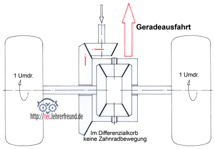 Geradeausfahrt: Beide Wellen drehen gleich schnell. Die Drehzahl des Tellerrads wird auf den Differenzialkorb übertragen. Die Ausgleichsräder und die Achswellenräder bilden in diesem Zustand ein starres System: Im Korb findet keinerlei Bewegung statt.