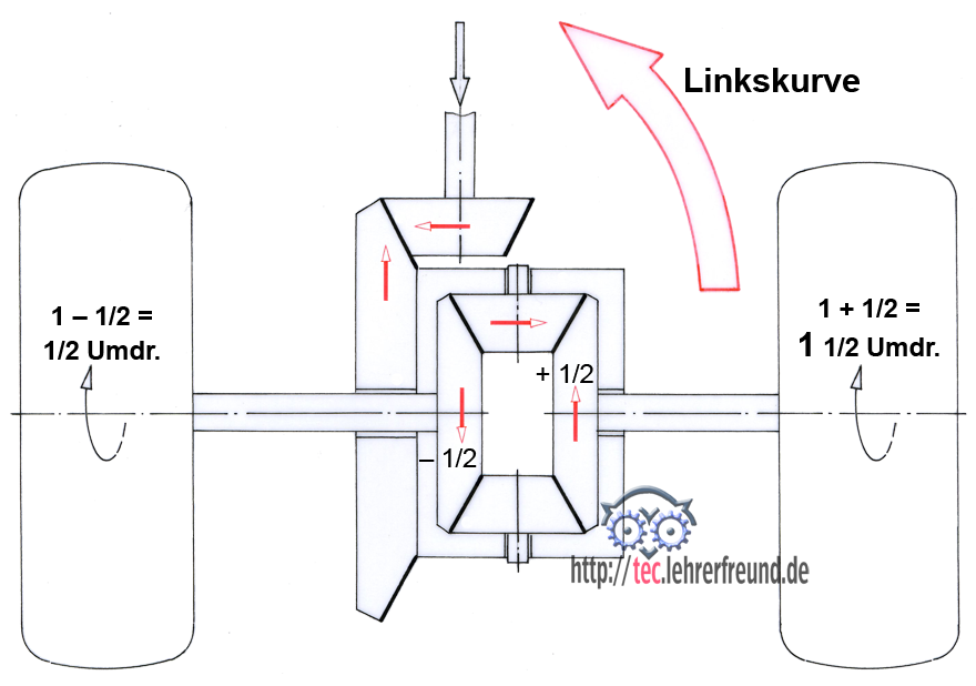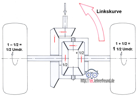 Linkskurve: Das Tellerrad mache 1 Umdrehung, das rechte Rad Rechts drehe 1 1/2 Mal. 1 1/2 Umdrehungen sind wie 1 Umdrehung + 1/2 Umdrehung. Dreht Rechts 1 Mal, dann dreht Links ebenfalls 1 Mal. Dreht man Rechts um 1/2 Umdrehung weiter, macht Links 1/2 Umdrehung rückwärts; insgesamt macht Links also 1 Umdrehung minus 1/2 Umdrehung rückwärts = 1/2 Umdrehung vorwärts.
