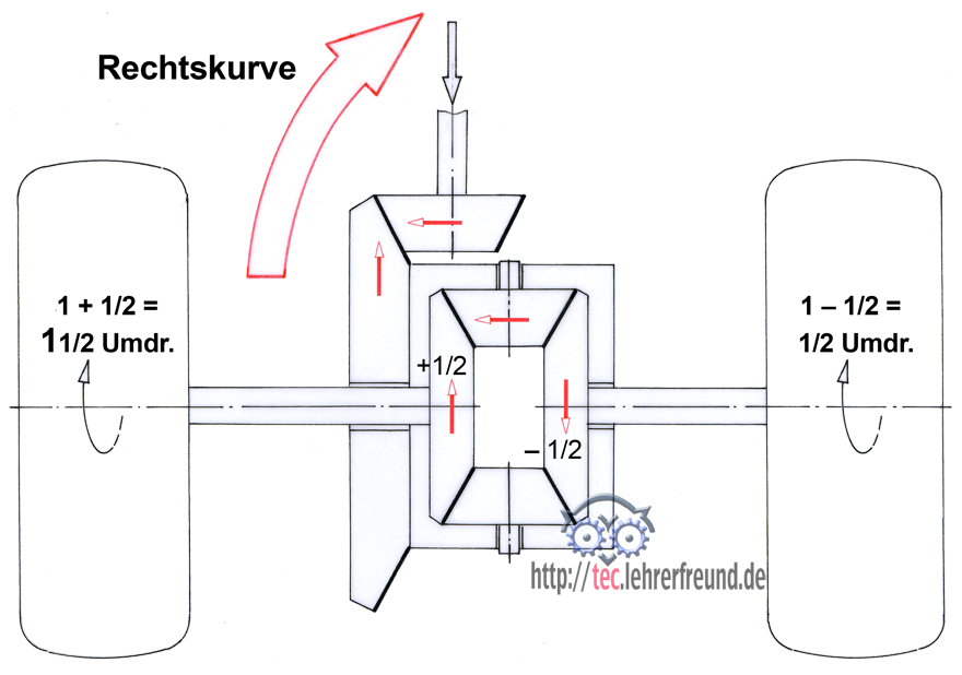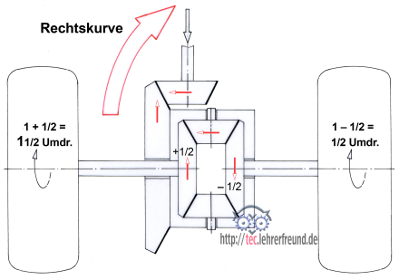 Rechtskurve: Das Tellerrad mache 1 Umdrehung, der linke Reifen drehe sich 1 1/2 Mal. 1 1/2 Umdrehungen = 1 Umdrehung + 1/2 Umdrehung. Dreht Links 1 Mal, dann dreht Rechts ebenfalls 1 Mal. Dreht man Links um 1/2 Umdrehung weiter (um die 1 1/2 Umdrehungen zu erhalten), macht Rechts 1/2 Umdrehung rückwärts; insgesamt macht Rechts also 1 Umdrehung minus 1/2 Umdrehung rückwärts = 1/2 Umdrehung vorwärts.