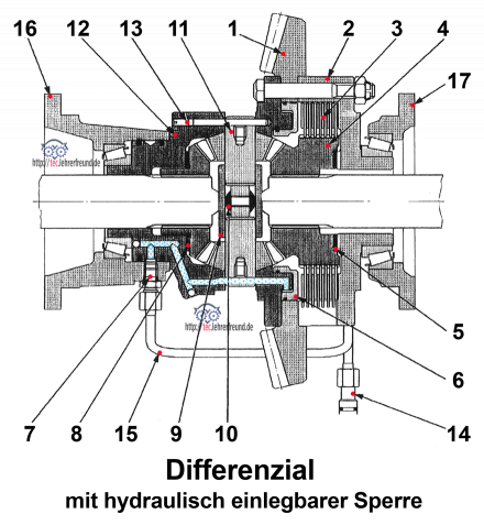 In der Konstruktion im Bild unten wird dabei über die Lamellenbremse 3 das Wellenrad 4 gegen den Differenzialkorb 2 blockiert. Die Lamellenbremse wird hydraulisch eingerückt: Vom Versorgungsanschluss 14 gelangt Drucköl über die Leitung 15 zum Einlass 7. 6 ist ein Druckkolben. 10 und 11 sind die Lagerbolzen, auf denen sich die Ausgleichsräder drehen.