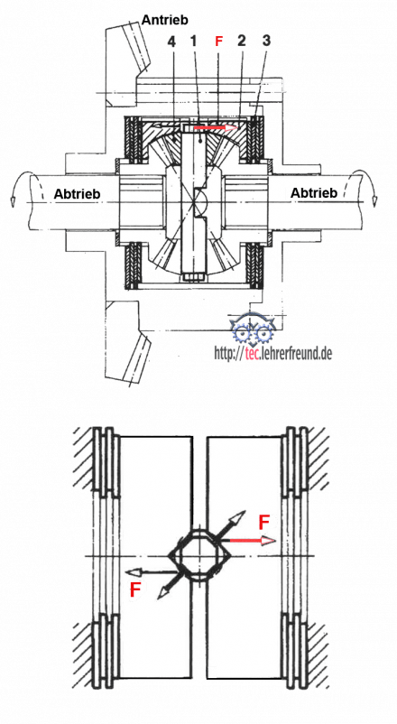 Das Selbstsperrdifferenzial besitzt gegenüber dem einfachen Differenzial zwei zusätzliche Druckringe 2, die axial verschiebbar, gegen Verdrehen aber gesichert sind. Zwischen dem Korb und den Druckringen sitzen die Lamellenpakete 3. Benötigt eine der Wellen ein größeres Durchzugsmoment als die andere, dann wird der Bolzen 1 durch die zwischen der Ausgleichsradbohrung und dem Bolzen vergrößerte Reibung etwas verdreht. Die Flächen an den Bolzenenden üben auf die Druckringe eine axiale Kraft F aus und pressen diese gegen die Lamellen. Die Seite, die durchdrehen möchte, wird von den Lamellen gebremst und kann nicht durchrutschen.