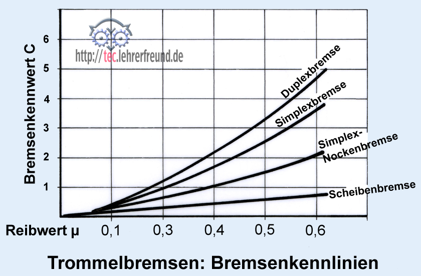 Die Grafik zeigt die Bremsenkennwerte C in Abhängigkeit vom Reibwert µ (mü, griech. Buchstabe). Die Kennlinien der Trommelbremsen haben einen progressiven Verlauf: Mit zunehmendem µ steigen ihre Bremsenkennwerte C stärker an.