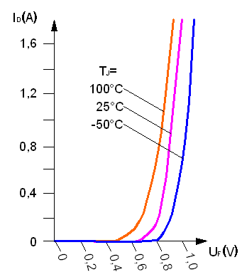 2. Diodenkennlinien, Bild oben: Durch eine 25 °C warme Diode fließt ein Strom mit 1,6 A. Welche Spannung liegt an?