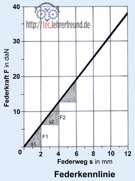 Die Federkennlinie stellt die Abhängigkeit der Federkraft F vom Federweg s dar. Ihr proportionaler Verlauf wird auch als »Federkonstante D« bezeichnet. Die geschwärzten Dreiecke im Bild zeigen die Proportionalität der Kennlinie: F1 : s1 = F2 : s2 = ... usw. An jeder Stelle der Kennlinie verlängern 6 daN Federkraft die Feder um 2 mm. Die Federkonstante ist in diesem Fall D = F : s = 60 N : 0,2 cm = 300 N/cm.