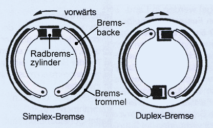 b) Duplexbremse (Bild): Sie hat zwei auflaufende Bremsbacken. Dadurch ist die Bremswirkung in Fahrtrichtung besser als bei der Simplexbremse. Allerdings steht bei Rückwärtsfahrt nur die Bremswirkung von zwei ablaufenden Backen zur Verfügung.
