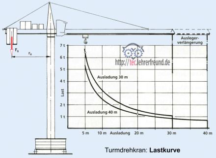 Zu jeder Auslegerlänge eines Kranes gibt es eine eigene Lastkurve, aus der sich die zulässigen Lasten ablesen lassen.
