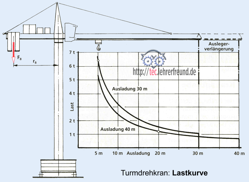 Wird der Ausleger auf 40 m verlängert, dann drückt das zusätzliche Auslegergewicht die Lastkurve nach unten. Bei zusätzlich 300 kg = 0,3 t würde dies vereinfacht auf die halbe Auslegerlänge 20 m gerechnet - ein Moment von 0,3 t ⋅ 20 m = 6 mt ergeben. Bei der 40-m-Kurve bleibt also nur noch ein zulässiges Lastmoment ML von 32 mt - 6 mt = 26 mt übrig. So liegt bei rL = 20 m der Kurvenpunkt bei 26 mt : 20 m = 1,3 t.
