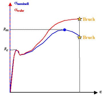 Zur Kennlinie: Wird die Zugprobe über Re hinaus belastet, beginnt sie sich einzuschnüren, d. h. ihr Querschnitt verringert sich. Die rote Kurve berücksichtigt die Einschnürung. Die blaue Kurve bezieht die Zugbelastung auf den ursprünglichen, also einen gleich bleibenden Querschnitt, weshalb ihre Werte tiefer liegen.