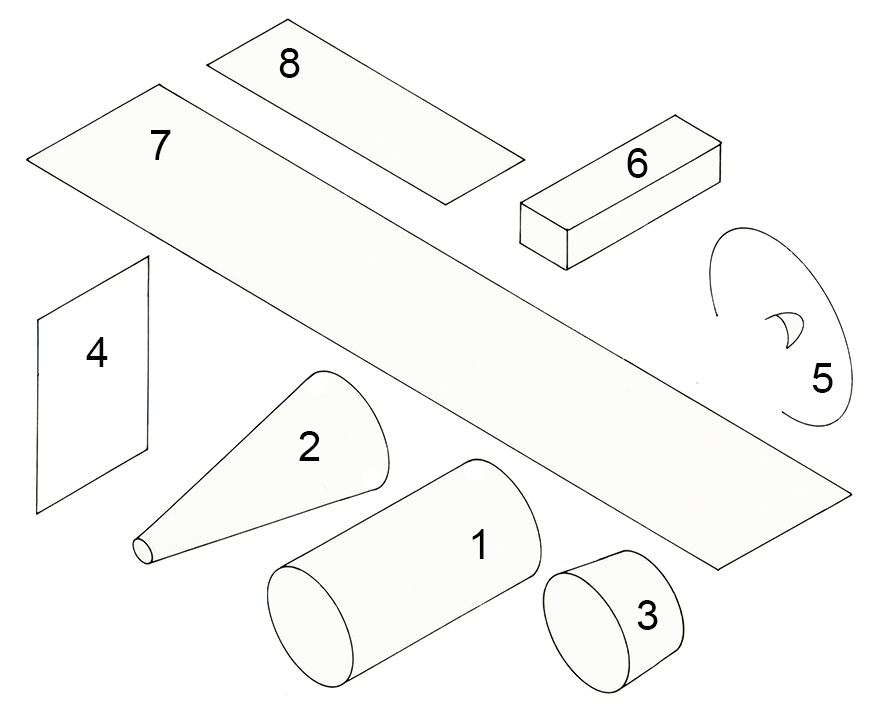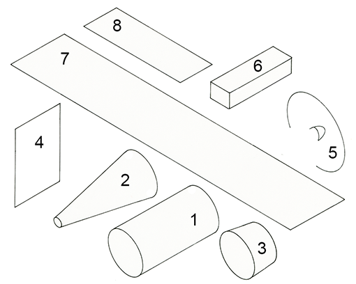 Bild 2  Vereinfachte Flächen und Körper 1 bis 8 in isometrischer Perspektive.