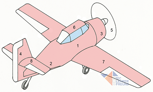 Wir zerlegen das Flugzeug in einfache geometrische Flächen und Körper. Im Bild sind sie mit den Nummern 1 bis 8 gekennzeichnet.