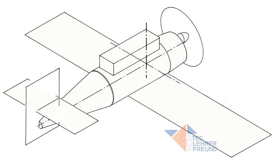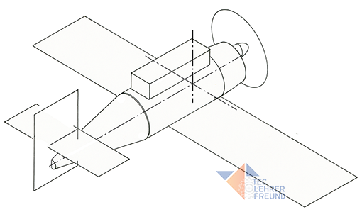 Analysiert man den Aufbau eines Flugzeugs, dann findet man, dass es aus einer Anzahl von einfachen Grundkörpern besteht: rechteckigen und trapezförmigen Platten, Prismen, Zylindern, Kegelstümpfen. Setzt man diese zusammen, dann führt dies schneller zum Zeichenergebnis als der Versuch, das Flugzeug in einem Zug zu zeichnen.