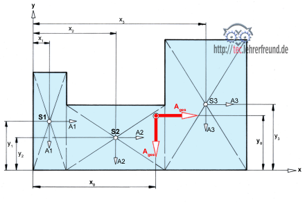 Wir zerlegen die Fläche in Teilflächen bekannter Schwerpunktlage entsprechen der Beschreibung im Beitrag »Flächenschwerpunkte«. Dann behandeln wir die Inhalte der Teilflächen (in cm2 oder mm2) wie Kräfte. Das ist erlaubt, denn: Wäre die Fläche ein dünnes Blech, dann kann man den Momentensatz für Kräfte bzw. Massen umformen. (Anmerkung: Genau genommen ist eine Fläche nicht durch einen Richtungspfeil (Vektor) darstellbar. Wir erlauben uns dennoch, Pfeile zu verwenden, weil wir immer den Vergleich mit der Kraft im Hinterkopf haben.)