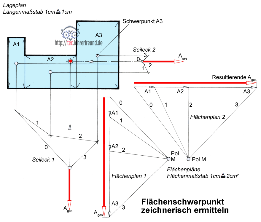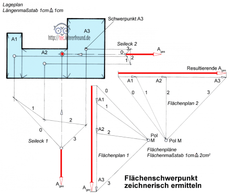 Rechnerisch und zeichnerisch den Schwerpunkt einer zusammengesetzten Fläche zu ermitteln, verlangt einigen Aufwand: Man muss die Fläche in Teilflächen bekannter Schwerpunktlage zerlegen und dann - bei der zeichnerischen Variante - mit dem Seileckverfahren operieren.