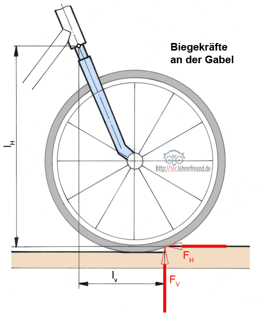 Bild unten: Biegung an der Gabel. Aus den Kräften FV und FH mit ihren Hebelarmen lV und lH ergeben sich die beiden Biegemomente MV = FV • lV und MH = FH • lH.