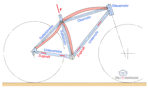 Der Fahrradrahmen muss Kräfte aufnehmen, die sich aus dem Fahrergewicht, dem Treten und durch Fahrbahnstöße ergeben. Aus Versuchen kennt man die zulässigen Lasten, bei denen - wenn man sie nicht überschreitet - Rahmenverformungen oder Brüche auszuschließen sind.