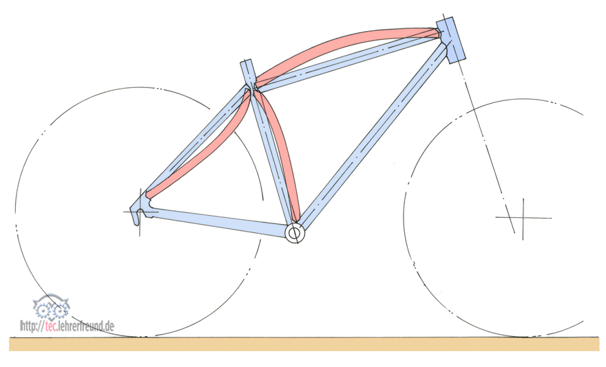 Plastisch verformt wird ein Körper, wenn er nach Wegnahme der Belastung seine neue Form beibehält. Die Horizontalkräfte bleiben unter 2000 N am Hinterrad und höchstens 1000 N an der Gabel. Die Unterstreben des Hinterbaus werden vorwiegend auf Zug beansprucht, der für die Rahmenteile ungefährlich bleibt.