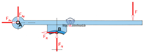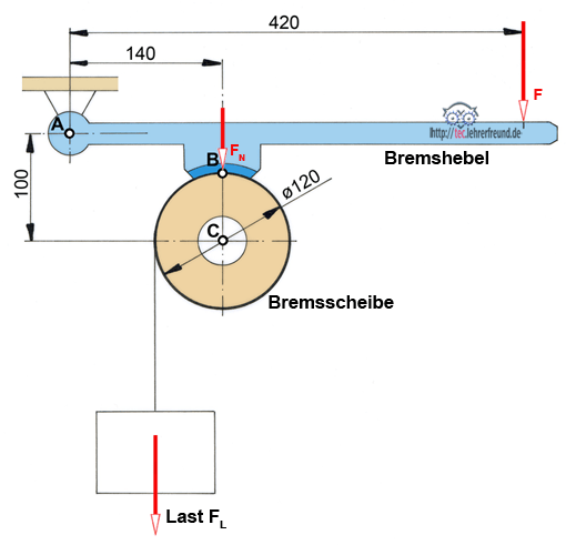 Durch Druck auf den Bremshebel (Kraft F) wird die Bremsscheibe in Ruhe gehalten. Der Bremshebel ist im Punkt A gelagert. Die vom Bremshebel auf die Bremsscheibe wirkende Kraft ist FN. Die Last FL = 850 N versucht, die Bremsscheibe in Drehung zu versetzen. Die Reibzahl µ ist 0,45.