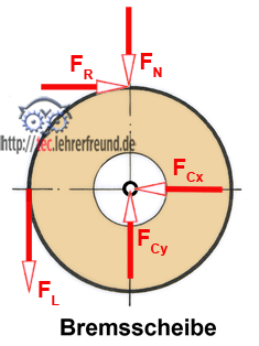 Größe und Richtung von FC sind nicht bekannt. Man berechnet sie über die Komponenten FCx und FCy. Aus der freigemachten Bremsscheibe ergibt sich: