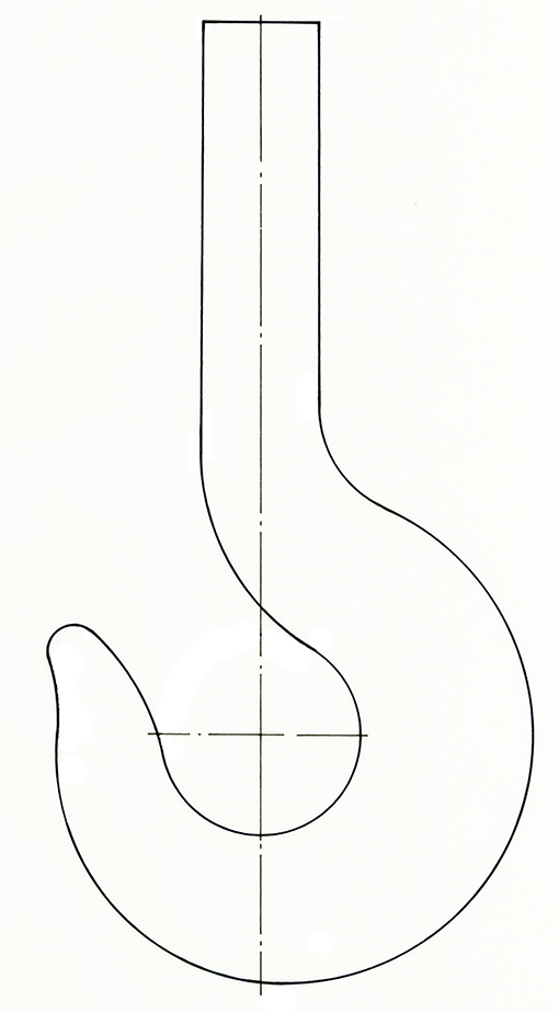 Es ist ein Kranhaken zu zeichnen. Die über das übliche Zeichnen hinausgehende Schwierigkeit liegt darin, dass der Haken zum größten Teil aus Kreisstücken zusammengesetzt ist.