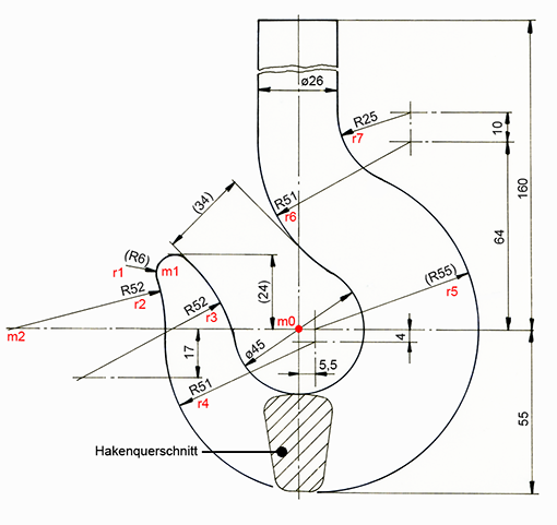 r7: m7 hat von m0 aus den senkrechten Abstand 74 mm ( = 64 + 10). Von der senkrechten Hakenmittelinie aus hat r7 den Abstand 38 mm ( = 13 + 25).
