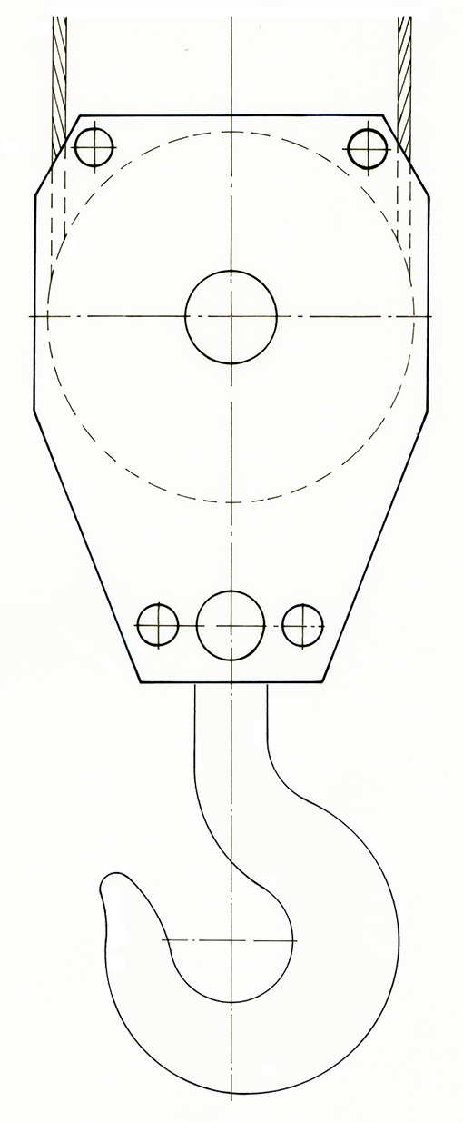 Konstruktiv bilden der Haken und die Seilrolle eine Einheit, die »Unterflasche«. Sie hängt mit den beiden Seilhälften am Krankopf, am Katzfahrwerk oder einer anderen Aufnahme.