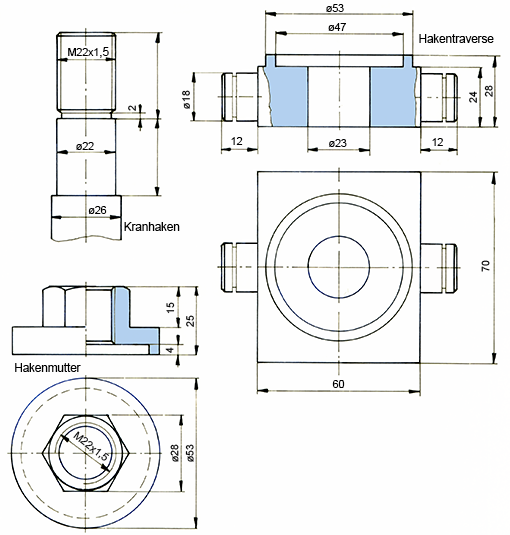 Die Einzelteile sind nicht vollständig bemaßt. Finden Sie die fehlenden Maße (z. B. die Ringnuten für die Sicherungsringe an der Hakentraverse).