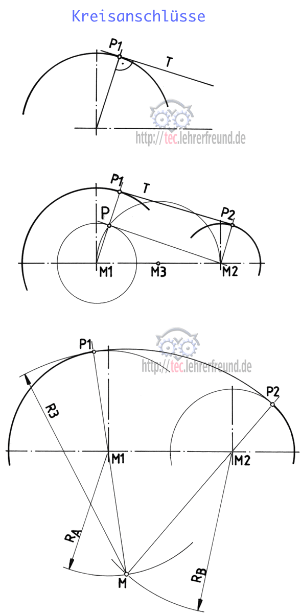 - Um M2 einen Kreisbogen mit RB = R3 minus R2 schlagen; Schnittpunkt M ist die Mitte von R3. Die Anschlusspunkte P1 und P2 ergeben sich als Schnittpunkte der verlängerten Strahlen M-M1 und M-M2.