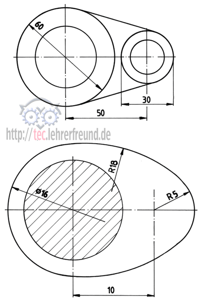 Immer wieder haben wir mit Formen zu tun, in denen Geraden auf Kreise oder Kreise auf Kreise treffen. Dies ist der Fall bei einem Riementrieb, wo der Riemen auf den Scheibenumfang auf- oder abläuft. Eine nicht ganz leichte Aufgabe für Schüler besteht darin, die genauen Anschlusspunkte zu finden. Da muss man echte Geometrie betreiben.