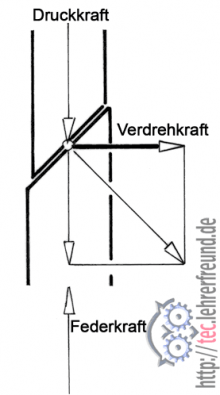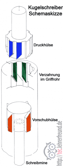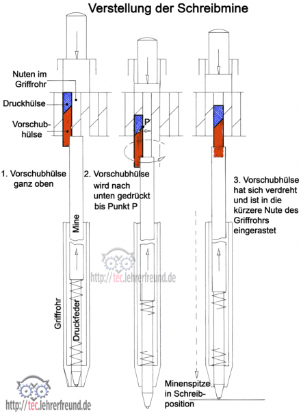 Die ganz unten an der Mine sitzende Feder drückt das rote Teil dauernd nach oben. An den Abschrägungen entsteht dadurch eine waagrechte Kraftkomponente, die die Vorschubhülse im richtigen Moment verdreht und in die nächste Nute einrasten lässt (Skizze Krafteck). Auf diese Weise sitzt sie einmal tiefer und einmal höher, d.h. die Mine schaut einmal heraus und einmal verschwindet sie im Griffrohr. Die vereinfachte Skizze »Verstellung der Schreibmine« vollzieht den Vorgang nach.