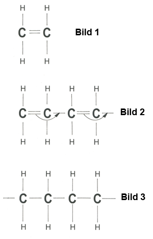 Bei der Herstellung des Polyethylens wird die Doppelbindung aufgebrochen (gebogener Pfeil in Bild 2). Das erste Aufbrechen geschieht in der »Startreaktion«, die Beendigung des Vorgangs in der »Abbruchreaktion«. Würde der Vorgang nach dem Abbrechen zu einem Makromolekül wie in Bild 3 führen, dann läge ein Stoff mit der Summenformel C4H8 vor.