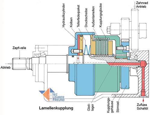 Die Zahnräder oben rechts treiben über das aufgeschraubte Stirnrad die Kupplungsglocke an. Diese nimmt das Außenlamellen-Paket mit. Erhält die Kupplung kein Drucköl, dann wird das gesamte Lamellenpaket von den Tellerfedern zusammengepresst und die Zapfwelle läuft mit. Wird die Kupplung unter Druck gesetzt, dann wandert der Hydraulikzylinder nach links und zieht die zwischen den Tellerfedern und dem Lamellenpaket liegende Druckscheibe mit: Außen- und Innenlamellen lösen sich voneinander - der Kraftfluss ist unterbrochen und die Zapfwelle bleibt stehen.
